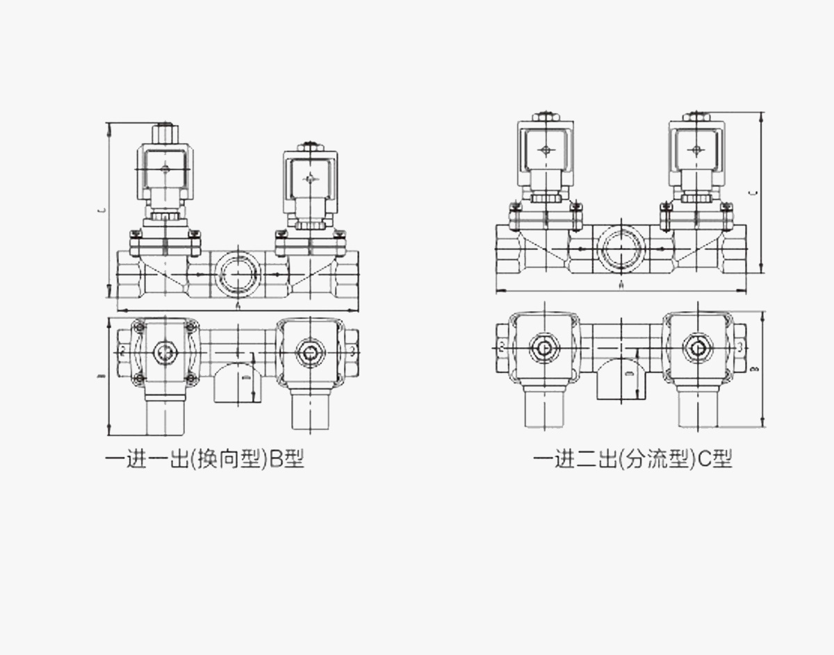 一進一出:常閉式(ZC2/3)---當電磁閥線圈通電時,接口2通向接口1,接口3關閉;當電磁閥線圈斷電時,接口2關閉,接口1通向接口3;常開式(ZC2/3K)當電磁閥線圈斷電時,接口3通向接口1,接口2關閉;當電磁閥線圈通電時,接口3關閉,接口1通向接口2;