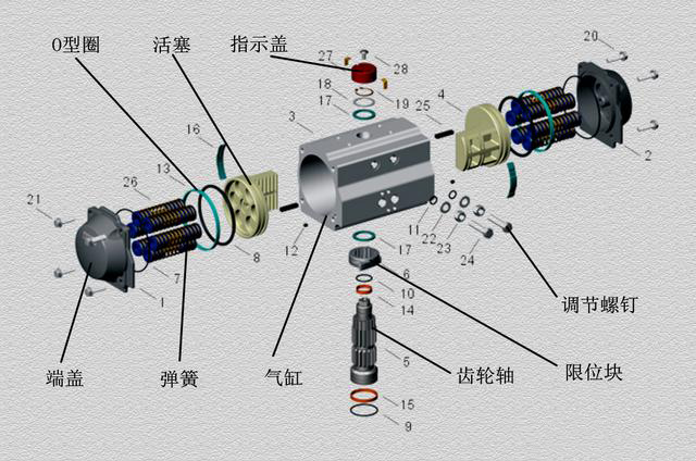 雙作用活塞式氣動執(zhí)行機構(gòu),主要有氣缸,端蓋,活塞。齒輪軸。限位塊,調(diào)節(jié)螺釘,指示器等零件組成。用壓縮空氣作為動力,推動活塞運動。活塞上集成了齒條帶動齒輪軸轉(zhuǎn)動90°,進而帶動球閥的開關(guān)動作。