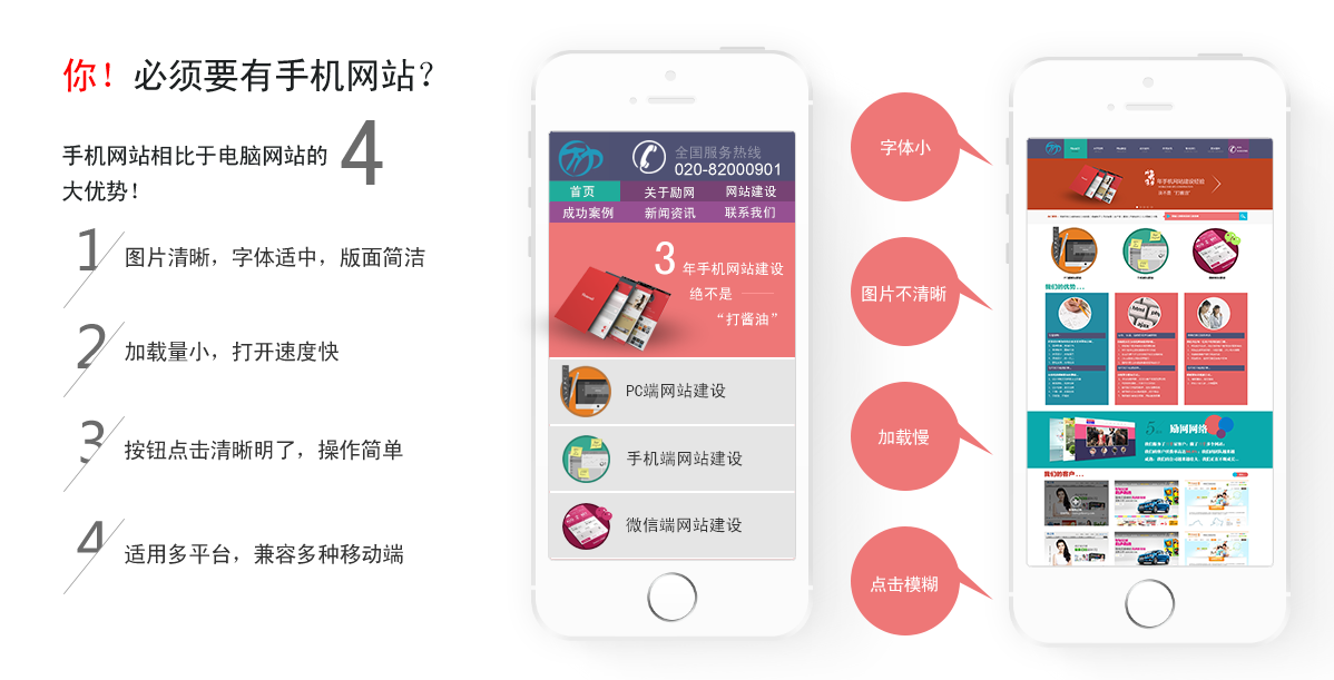 手機(jī)網(wǎng)站時(shí)代迅猛來(lái)襲,你OUT了?截至2014年底,手機(jī)網(wǎng)民數(shù)達(dá):6.3億網(wǎng)站流量有33%來(lái)自移動(dòng)互聯(lián)網(wǎng)并持續(xù)上升中56%的移動(dòng)互聯(lián)網(wǎng)網(wǎng)民每天上網(wǎng)1小時(shí)以上78%每天至少手機(jī)上網(wǎng)1次以上4G時(shí)代已經(jīng)來(lái)臨,智能大屏手機(jī)的發(fā)展,手機(jī)網(wǎng)站應(yīng)運(yùn)而生,發(fā)展迅猛。如果你現(xiàn)在還沒(méi)有手機(jī)網(wǎng)站,你已經(jīng)遠(yuǎn)遠(yuǎn)落后于競(jìng)爭(zhēng)對(duì)手了