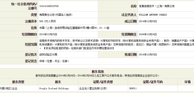 澎集信息成立于2014年12月25日,股東為Google Ireland Holdings(谷歌愛爾蘭控股),法人代表是William Anthony Farris,注冊(cè)資本為500萬元。該公司的經(jīng)營(yíng)范圍包括:信息技術(shù)領(lǐng)域內(nèi)的技術(shù)開發(fā)、技術(shù)轉(zhuǎn)讓以及技術(shù)咨詢;計(jì)算機(jī)軟件的開發(fā)(除計(jì)算機(jī)信息系統(tǒng)安全專用產(chǎn)品)、制作,銷售自產(chǎn)產(chǎn)品;計(jì)算機(jī)系統(tǒng)集成;計(jì)算機(jī)軟件產(chǎn)品(除計(jì)算機(jī)信息系統(tǒng)安全專用產(chǎn)品)及其他組件的批發(fā)、進(jìn)出口、傭金代理(拍賣除外)及其他相關(guān)配套業(yè)務(wù)。從澎集信息的經(jīng)營(yíng)范圍上看,已經(jīng)涵蓋了谷歌此前撤出的業(yè)務(wù)內(nèi)容,包括網(wǎng)頁搜索和郵箱服務(wù)。歌或許期望,可以在上海自貿(mào)區(qū)享受“境內(nèi)關(guān)外”的政策,作為重返中國(guó)的第一步。