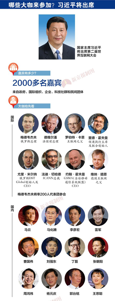 本屆世界互聯(lián)網(wǎng)大會主題為“互聯(lián)互通共享共治——共建網(wǎng)絡(luò)空間命運(yùn)共同體”。與去年相比,本屆大會規(guī)模更大。大會將有2000多名嘉賓與會,中外嘉賓比例約各占50%,其中有8位外國領(lǐng)導(dǎo)人,近50位外國部長級官員,包括俄羅斯總理梅德韋杰夫、巴基斯坦總理謝里夫、哈薩克斯坦總理馬西莫夫、吉爾吉斯斯坦總理薩里耶夫、塔吉克斯坦總理拉蘇爾佐達(dá)等。